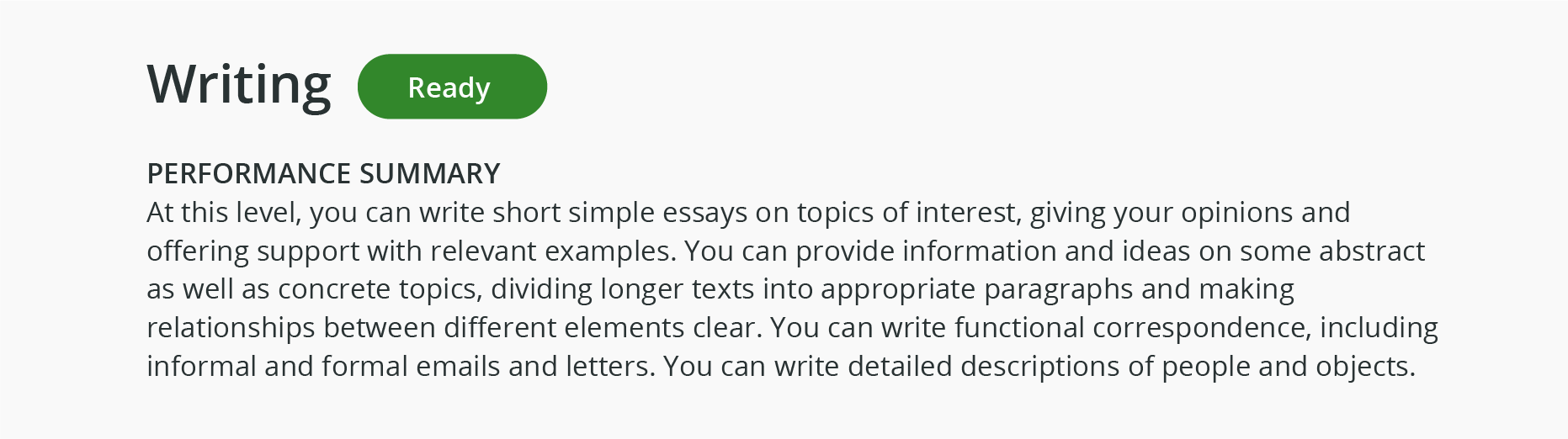 Questo rapido test online ti rivelerà se sei pronto a sostenere un esame di inglese, come il Pearson English International Certificate. Il Readiness Test predice la tua preparazione complessiva, suddividendo dettagliatamente conversazione, ascolto, lettura e scrittura.Se sei pronto, ti dà un’iniezione di fiducia.